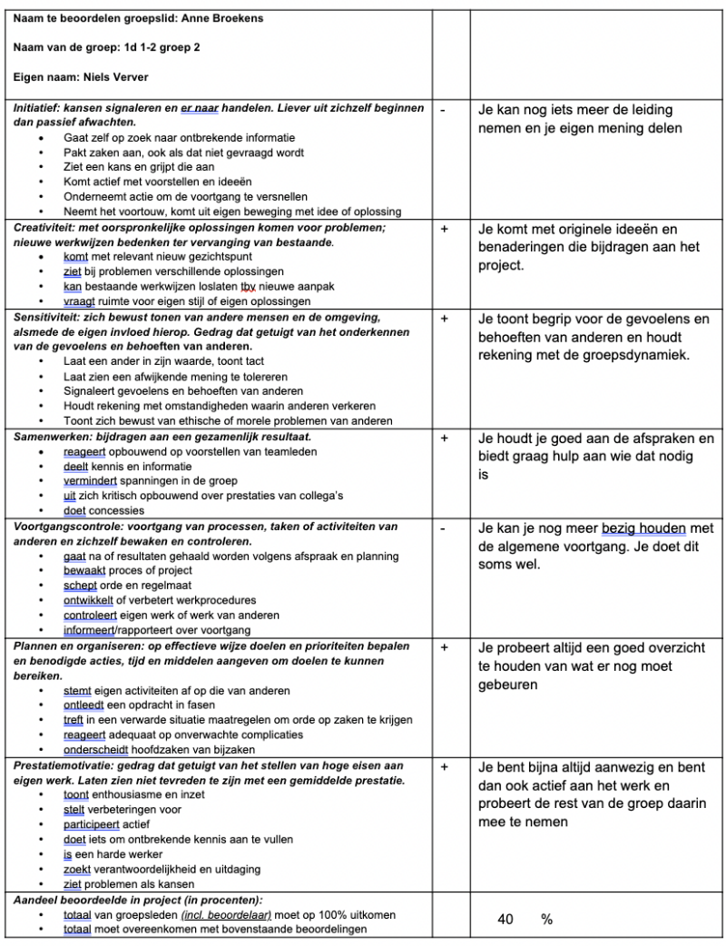 Tijdens het project ben ik door mijn groepsleden positief beoordeeld op meerdere punten. Ze vonden dat ik goed samenwerkte, openstond voor anderen en rekening hield met gevoelens binnen de groep. Ook vonden ze dat ik vaak met originele ideeën en andere invalshoeken kwam, wat goed van pas kwam bij het oplossen van problemen in het project. Mijn inzet en motivatie werden gewaardeerd: ik was aanwezig, werkte actief mee en pakte taken op zonder te klagen.